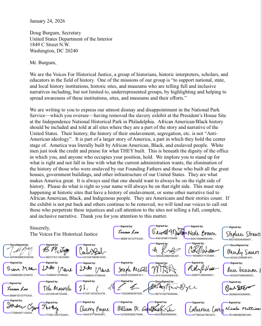 On January 22, 2026, at the direction of the Trump Administration, all exhibit panels on the history of enslavement at the Presiden’t House site at Independence National Historical Park in Philadelphia were removed after having been flagged for review. These panels portrayed the history of the President’s House when the nation’s capital was temporarily located in that city, including the history of the house, and the roles of the Washington’s enslaved people and the enslaved in American society. Since the removal of these panels, the City of Philadelphia has filed suit against the Trump Administration to have the panels returned. Numerous other groups, including the Voices For Historical Justice, have also mobilized in response. On February 12, the Voices For Historical Justice sent the below letter to Doug Burgum, Secretary of the Interior, calling out the injustice of the removal of the slavery exhibit at the President’s House Site.