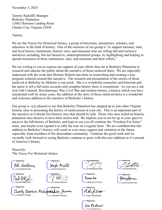 In November 2025, members of the Voices For Historical Justice sent a signed letter to Berkeley Plantation in Charles City County, Virginia, to encourage them to continue presenting the narrative of slavery at their site. Berkeley was the home of Signer, Benjamin Harrison V, and most importantly, a large enslaved population. A tour and exhibits on the enslaved of Berkeley had been put together by their docent, Melanie Roberts, the first time that this has ever been done at Berkeley Plantation. Melanie pulled out all the stops in performing months and months of research and using her own funds to make it happen. For calendar year 2026, Berkeley is scaling back the number of times the tour is being offered to only twice a year, other times are by appointment only. Want to know how you can help? Go to their Facebook page or contact them through their website (Contact | Berkeley Plantation) and encourage them to offer the “Freedom For Some Tour” on a more regular basis. This is a new and important part of history that Berkeley must share with the public, the voices of those once enslaved there deserve to be heard.